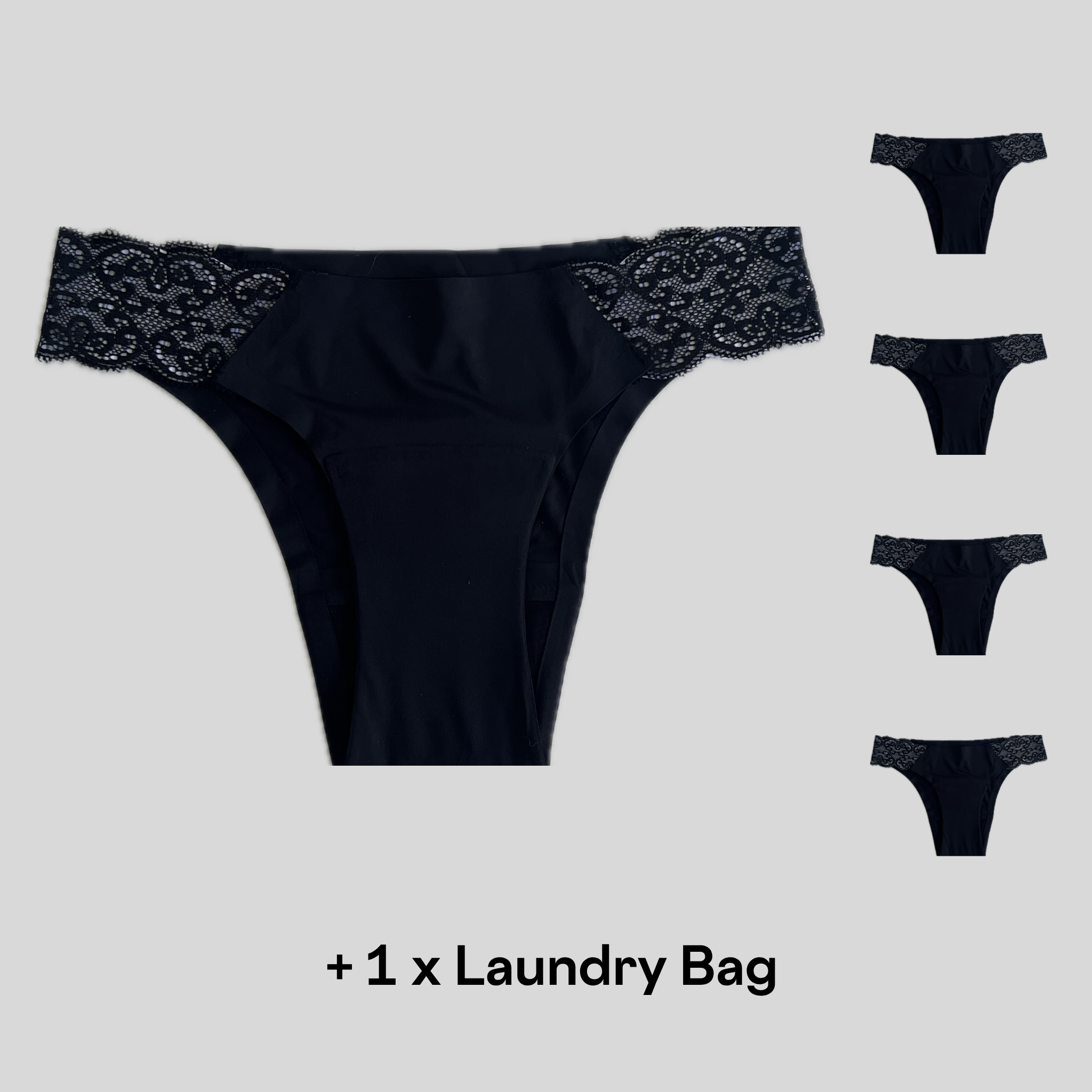 Includes 5 pairs of Brazilian period undies and 1 x Laundry Bag