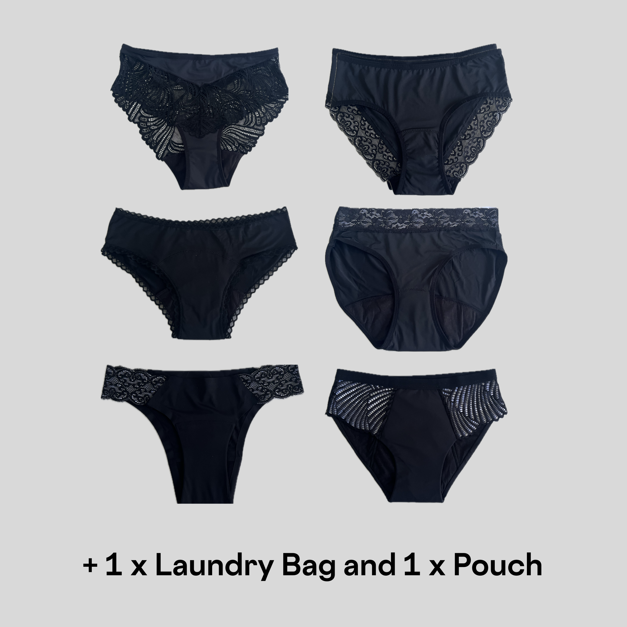 Includes 6 pairs of period undies: 1 x The Fancy Pants 1 x The Sleep Tight, 1 x Full Brief, 1 x Lacy Bum, 1 x The Sweetheart and 1 x Brazilian plus 1 x Laundry Bag and 1 x Pouch.